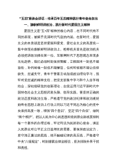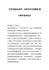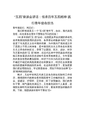 同志们、青年朋友们:明天,就是“五四”青年节了,在这个属于青春的日子里,我们召集机关年轻干部在一起,共同追忆“爱国、进步、民主、科学”的“五四”精神,共同坚定爱岗敬业、恪尽职守、勇于创新的信心和决心,我觉得很有意义,也很有必要。首先,我代表办党组向在座的各位青年党员干部职工,表示节日的问候和美好的祝愿!刚才,XXX等6位青年干部向大家汇报了思想、学习和工作情况。他们的发言很有感触,很受启发,充分体现了当代青年报效祖国的远大志向、朝气蓬勃的精神风貌、自强不息的意志品格、甘于奉献的思想境界,充分体现了青年干部对中国特色社会主义的坚定信念、对实现中华民族伟大复兴中国梦的必胜信心。97年前,一批批热血...