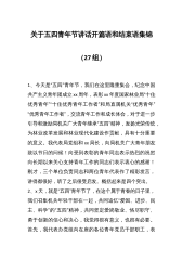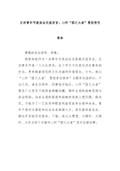 五四青年节座谈会交流发言:心怀“国之大者”勇担责任使命尊敬的各位领导、同事:很荣幸能作为一名青年代表站在这里做交流发言,五四青年节是一个文化符号,这个节日不仅是对历史事件的纪念,更承载着深远的文化内涵和价值观念。今天,我以“心怀‘国之大者’勇担责任使命”为题作交流研讨,不当之处,请各位领导、同事批评指正。心怀“国之大者”要求广大党员干部具备高瞻远瞩、胸怀全局的战略思维与政治觉悟,站在全局的高度和战略的角度上想问题、做决定,不能为了一己私利和眼前利益而放弃全局和未来。青年干部作为国家和社会未来栋梁之才,肩负着承前启后、继往开来的历史使命。下面,我从大理想、大胸怀、大情怀、大作为四个方面对心怀“国...
