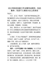 在公司科技创新工作会暨劳动模范、先进集体、先进个人表彰大会上的讲话同志们:今天,在“五一”劳动节、“五四”青年节即将来临之季,我们隆重召开x20xx年科技创新工作会暨20xx年度劳动模范、先进集体、先进个人表彰大会,表彰公司劳动模范、先进集体、优秀个人,弘扬科学精神、劳动精神、集体主义精神、劳模精神、工匠精神。首先,我代表xx,向x全体干部职工,致以节日的祝贺!向为x发展建设作出突出贡献的劳动模范和先进工作者,致以崇高的敬意!向全体干部职工家属,致以诚挚的问候!xx项目,于20xx年建成投产。采用世界领先成熟的工艺技术,创造了“xx速度”。投产以来,共计生产x吨,硫酸x万吨,成为x省一张新的名...