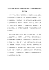 某社区青年2022年五四青年节“喜迎二十大奋进新征程”主题演讲稿今年下半年,中国共产党将召开第二十次全国代表大会,这是全体中华儿女政治生活中的一件大事,作为新时代的青年党员,我们要持续拓展党史学习教育成果,进一步用党的百年奋斗重大成就和历史经验增长智慧、增进团结、增加信心、增强斗志,以青春之梦想,以担当之精神,为实现第二个百年奋斗目标,实现中国梦汇聚起强大的青春力量。今天我演讲的题目是《不忘初心跟党走勇毅前行开新局》。其作始也简,其将毕也必巨。1921年中国共产党成立后,带领人民走过风雨沧桑、灿烂辉煌,从嘉兴南湖的一艘小小红船成长为领航中国行稳致远的巍巍巨轮。中国共产党领导人民走过的一百年,是...