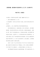 党课讲稿:做好新时代党的青年人才工作(五四青年节、年轻干部、共青团)中央团校(中国青年政治学院)教授(2024年6月5日)一、新时代要做好青年人才工作人才是指拥有一定的专业知识或专门技能,能进行创造性劳动并对社会作出贡献的人,是人力资源中能力和素质较高的劳动者。 青年是国家的未来、民族的希望。青年兴则民族兴,青年强则国家强。促进青年的更好成长与更快发展,是国家的基础性、战略性工程。青年不仅是祖国的未来,更是事业的希望。能否源源不断地培养与造就一大批青年人才,能否推动青年英才的脱颖而出,这在很大程度上决定了党和国家事业的发展前景。我们应当重视培养、选拔与使用青年人才,敢于让优秀的青年人才担当重...