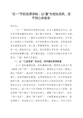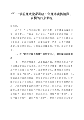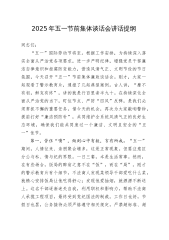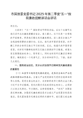 市国资委党委书记2025年第二季度“五一”假前廉政提醒谈话会讲话同志们:大家好!“五一”国际劳动节即将来临,在这个关键节点我们召开此次廉政提醒谈话会,意义重大。这不仅是一次常规的节前教育,更是我们强化党风廉政建设,深入落实全面从严治党战略部署的关键行动。在此,我代表市国资委党委,向辛勤工作的全体同志致以节日的问候,在此,我谨代表市国资委党委,向所有辛勤耕耘的同志们致以崇高的节日敬意,希望大家在假期能放松身心、陪伴家人,同时也时刻牢记廉洁自律的要求,确保度过一个风清气正、欢乐祥和的节日。下面,我讲几点意见。一、提高政治站位,充分认识加强节日期间党风廉政建设的重要性(一)加强节日期间党风廉政建设,...