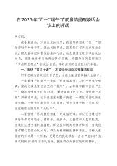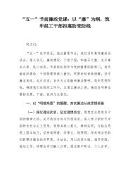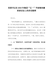 党委书记在2025年集团“五一”节前集体廉政谈话会上的讲话提纲同志们:“清风两袖朝天去,免得闾阎话短长。”廉洁从政是我们每一位干部必须坚守的底线,是党和人民对我们的基本要求,更是我们事业发展的重要保障。“五一”佳节将至,在这个重要的时间节点,我们召开此次集体廉政谈话会,旨在进一步增强大家的廉洁自律意识,筑牢拒腐防变的思想防线,确保大家度过一个风清气正、欢乐祥和的节日。下面,我讲几点意见,与同志们共勉。一、以“悬衡而知平,设规而知圆”的精准思维,强化廉洁意识(一)深刻认识廉洁从政的重要意义。廉洁从政是我们党的优良传统和政治本色。从建党之初,我们党就把廉洁自律作为党员的基本要求,无数革命先辈用自己...