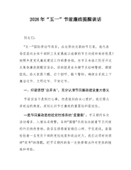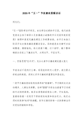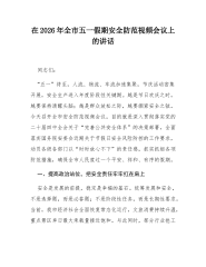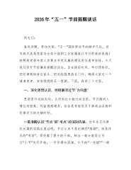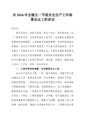 在2026年全镇五一节前安全生产工作部署会议上的讲话同志们:四月芳菲尽,初夏气息浓。再过十余天,我们将迎来“五一”国际劳动节。这是劳动者自己的节日,也是群众出游探亲、消费娱乐的高峰期。人流物流车流高度聚集,各类风险隐患交织叠加,安全生产形势严峻复杂。今天把大家召集起来,召开全镇五一节前安全生产工作部署会议,主要任务就是贯彻落实上级关于安全生产的决策部署,分析研判当前我镇安全形势,对节日期间重点工作进行再动员再安排、再落实,确保全镇人民过一个平安、祥和、欢乐的节日。一、认清形势保持清醒,时刻绷紧安全之弦安全生产是民生大事,一丝一毫不能放松。回顾今年以来全镇安全工作,虽然总体平稳,但必须看到,基础...