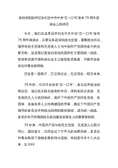 政协党组副书记在纪念中共中央“五一口号”发布75周年座谈会上的讲话今天,我们在这里召开纪念中共中央“五一口号”发布75周年座谈会,主要任务是深化政治交接,凝聚政治共识,缅怀各民主党派和无党派人士与中国共产党团结奋斗的光辉历程,促进我们更加自觉地巩固和壮大爱国统一战线,坚持和完善中国特色社会主义新型政党制度,不断开创多党合作事业新局面。历史是一面镜子,它记录过去,见证现在,昭示未来。75年前,中共中央发布“五一口号”,发出召开政治协商会议、成立民主联合政府的号召,得到各民主党派、无党派民主人士热烈响应,揭开了中国共产党同各党派、各团体、各族各界人士协商建国的序幕,奠定了中国共产党领导的多党合作和...