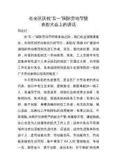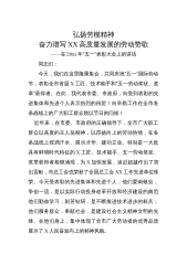 在庆祝“五一”国际劳动节暨全省五一劳动奖表彰大会上的讲话同志们:在这里参加这个会让我特别亲切,我曾经在工会工作过整整三年四个年头,我来过两次XX,带队来XX就来这里学习考察,就住在这里。由衷的感到回家,天下工会是一家,走到哪里都是你的家,回家的感觉的真好。今天我们在这里隆重集会,我们是要庆祝自己的节日庆祝全世界劳动者的光辉节日——“五一”国际劳动节,表彰我省荣获全国、全省“五一”劳动奖状、奖章和“工人先锋号”的先进集体与先进个人。首先,我代表省委、省政府,向受到表彰的先进集体和先进个人向在各条战线上作出优异成绩的劳动模范和先进工作者致以崇高的敬意!向广大劳动群众致以节日的祝贺!向各级工会干部和...