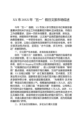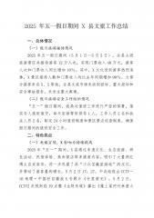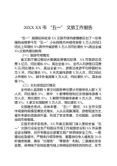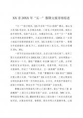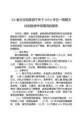 XX省文化和旅游厅关于20XX年五一假期文化和旅游市场情况的报告今年五一假期,在省委、省政府的坚强领导和文化和旅游部的有力指导下,全省文化和旅游系统一手抓安全生产、一手抓服务保障,全力推动假日文化和旅游市场安全平稳、规范有序运行,文化和旅游消费热起来、旺起来。假日期间,全省文化和旅游部门未收到安全生产事故、重大游客投诉、重大网络舆情报告。一、基本情况据大数据测算,五一假期全省共接待游客X万人次、实现旅游消费总额X亿元,同比分别增长X%、X%。全省纳入统计的X家A级旅游景区五天累计接待游客X万人次、门票收入X万元,同比分别增长X%、X%。全省图书馆、文化馆、博物馆累计接待群众X万人次。二、主要特...