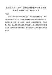 在全区庆祝“五一”国际劳动节暨劳模表彰大会上的讲话范文(1)同志们:今天,我们在这里隆重集会,热烈庆祝“五一”国际劳动节。首先,我代表区委、人大、政府、政协,向辛勤奋斗在全区各行各业、各条战线的工人、农民、知识分子和广大劳动群众,向驻区部队指战员、武警官兵和公安民警,致以节日的问候!向受到表彰和命名的劳动模范、“x工匠”、创新工作室等先进集体和个人表示热烈的祝贺!向所有为x区经济社会发展作出贡献的各界人士致以崇高的敬意!劳动创造财富,奋斗谱写辉煌。全区上下认真贯彻落实党的二十大精神,解放思想、锐意进取、真抓实干、努力拼搏,全区政治、经济、文化、社会、生态文明建设等各方面都取得了新的成绩,地区生...