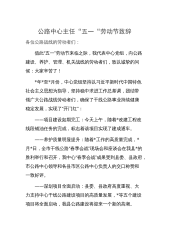 庆祝“五一”国际劳动节暨表彰大会、“五一“劳动节致辞发言、讲话材料汇编(10篇)目录1.中心主任“五一“劳动节致辞...................................22.“五一“劳动节致辞3.主任在庆祝“五一”国际劳动节暨表彰大会上的发言4.在庆祝“五一”国际劳动节暨表彰大会上的发言(范文)5.校长在五一国际劳动节的致辞6.劳动创造美好奋斗成就未来7.在庆祝“五一”国际劳动节暨表彰大会上的发言(集团公司)8.董事长五一劳动节致辞(集团公司)9.总经理五一劳动节致辞(集团公司)10.在庆祝“五一”国际劳动节暨全国五一劳动奖和工人先锋号表彰大会上的讲话(范文)中心主任“五一“劳...