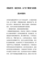 在县委农村工作领导小组会议暨创建乡村振兴示范区重点工作推进会议上的发言根据会议安排,下面我就XX2023年推进乡村振兴示范创建工作作以简要汇报,不妥之处,恳请批评指正。2023年,XX抢抓国家、省级乡村振兴示范村创建契机,紧紧围绕创建全省乡村振兴示范区目标,以生态地灾搬迁为突破口,以乡村建设为重点,全力推进组织振兴、乡村建设、产业发展、基层治理等工作,持续提升群众生产生活品质,加快建设宜居宜业和美乡村。一、坚持党建引领,以组织建设牵引乡村振兴。一是建强战斗堡垒。把党建引领作为推动乡村振兴的“第一动力”,持续开展基层党建“四化四提”强基固本行动和星级标准化党支部对标争创活动,通过抓基层、强基础、...