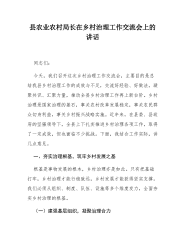 县农业农村局长在乡村治理工作交流会上的讲话同志们:今天,我们召开这次乡村治理工作交流会,主要目的是总结我县乡村治理工作的成效与不足,交流好经验、好做法,凝聚共识、汇聚力量,推动全县乡村治理工作再上新台阶。乡村治理是国家治理的基石,事关农村改革发展稳定,事关农民群众切身利益,事关乡村振兴战略实施。近年来,在县委、县政府的坚强领导下,全县上下扎实推进乡村治理各项工作,取得了一定成效,但也面临不少挑战。下面,我结合工作实际,讲几点意见。一、夯实治理根基,筑牢乡村发展之基根基是事物发展的根本,乡村治理亦是如此。只有把基础打牢乡村治理才能行稳致远,乡村发展才能获得坚实支撑。我们必须从组织、制度、队伍、设...