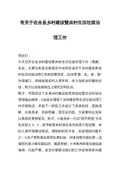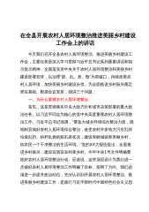 在全县开展农村人居环境整治推进美丽乡村建设工作会上的讲话今天我们召开全县农村人居环境整治、推进美丽乡村建设工作会,主要任务是深入学习贯彻习近平总书记系列重要讲话和指示批示精神,全面落实党中央关于农村人居环境整治和美丽乡村建设部署安排,以治理“脏、乱、差、散”为突破口,持续改善农村人居环境,加快美丽乡村建设步伐,为全面推进乡村振兴奠定坚实基础。根据会议安排,我讲三个问题:一、为什么要抓农村人居环境整治首先,这是贯彻落实中央大政方针和省市决策部署的重大政治任务。以习近平同志为核心的党中央高度重视农村人居环境整治工作。习近平总书记强调,“要加大城乡环境综合整治力度,因地制宜搞好农村人居环境综合整治,...