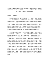 在全市高质量发展推进会暨2023年一季度重大项目集中签约、开工、竣工活动上的讲话同志们,朋友们:春风浩荡征途新。节后上班第一天,省委、省政府就以“开年即决战、起步即冲刺”的奋斗姿态召开全省高质量发展大会,向全社会释放了加快高质量发展的强烈信号。今天我们在这里召开现场会,用实际行动贯彻省的会议精神,以高质量发展的步步推进,赢得现代化建设的节节胜利。走过35年峥嵘岁月,**经济总量从建市之初的**亿元到现在的****多亿元,增长了**多倍,在量的积累上打下了良好基础。进入新的发展阶段,量的增速逐步减缓、质的突破还在酝酿,我们在发展中遇到的困难和问题,从根本上说都是发展质量不高的表现,也只有依靠高质...