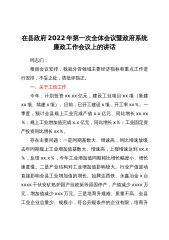 在县政府2022年第一次全体会议暨政府系统廉政工作会议上的讲话同志们:根据会议安排,我就分管领域主要经济指标和重点工作进行安排,不妥之处,请批评指正。一、关于工信工作今年,计划投资xx.xx亿元,建设工业项目xx项(新建xx项、续建x项)。目前,已开工建设x项,开工率xx%。一季度,预计全县规上工业完成产值x.x亿元、同比增长xx.xx%;规上工业增加值完成x.x亿元,同比增长x%;工业固定资产投资同比增长xx%。存在主要问题:一是同期基数大、增速高,同比增速放缓去年同期规上工业增加值基数大、增速高,上报增速达到xx.x%,反馈xx.x%,今年工业增加值同期相比增长幅度小、增长速度慢。二是产业...