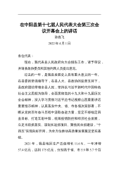 在中阳县第十七届人民代表大会第三次会议开幕会上的讲话孙燕飞2022年4月1日各位代表:现在,我代表县人民政府向大会报告工作,请予审议,并请县政协委员和其他列席人员提出意见。过去的一年,是我县发展史上具有重大意义的一年。在县委的坚强领导下,在县人大、县政协的监督支持下,县政府团结带领全县人民,坚持以习近平新时代中国特色社会主义思想为指导,全面贯彻党的十九大和十九届历次全会精神,深入学习贯彻习近平总书记视察山西重要讲话重要指示精神,认真落实中央、省、市各项决策部署,不断从党的百年奋斗历程中汲取奋进力量,坚定不移锚定四县目标、打造五彩中阳,统筹疫情防控和经济社会发展,立足当前抓落实、谋划长远抓项目、...