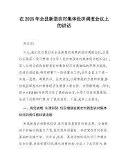 在2025年全县新型农村集体经济调度会议上的讲话同志们:今天,我们在这里召开全县新型农村集体经济调度会议,主要任务是深入学习贯彻《中华人民共和国农村集体经济组织法》,深入分析当前我县新型农村集体经济发展面临的形势与挑战,总结交流经验,研究部署下一阶段重点工作,动员全县上下进一步统一思想、凝聚共识、压实责任,以超常规的力度和举措,推动我县新型农村集体经济发展再上新台阶、实现新跨越。刚才,部分乡(镇)的负责同志作了很好的发言,介绍了项目进展情况,也谈了问题和打算,听了很受启发。下面,我讲三点意见。一、肯定成绩,认清形势,切实增强发展壮大新型农村集体经济的责任感和紧迫感发展新型农村集体经济,是巩固拓...