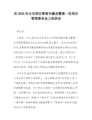 在2025年公司项目管理专题会暨第一次项目管理委员会上的讲话同志们:大家好。今天,我们在这里召开公司项目管理专题会暨第一次项目管理委员会会议,时机关键,意义重大。本次会议的核心任务,是聚焦项目精益管理和安全质量环保管控这两条生命线,系统总结上半年工作,精准部署下半年任务。刚才,*同志对下一阶段的工作进行了具体安排,相关单位,包括*公司、*公司、*公司、*公司也分别作了专题汇报,讲得都很好,问题找得准,措施也比较实。希望大家认真领会,关键是狠抓落实。今年以来,面对复杂严峻的市场环境和日益激烈的行业竞争,公司全体干部职工迎难而上、奋力拼搏,各项工作取得了来之不易的成绩。但同时,我们更要清醒地认识到...
