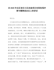 在2025年全区老旧小区改造项目攻坚收尾冲刺专题推进会议上的讲话同志们:今天我们召开这次专题推进会议,主要任务是分析研判当前我区老旧小区改造工作的形势,聚焦攻坚收尾阶段的重点难点问题,进行再动员、再部署、再加压,动员全区上下以决战决胜的姿态,全力冲刺,确保这项重大民生工程、民心工程善始善终、善作善成。刚才,市住建局的*同志,以及各参建单位、街道社区的负责同志都作了很好的发言,既汇报了进展,也亮明了态度,更指出了问题,听了很受启发。在此,我代表区委、区政府,向亲临现场指导的市住建局*同志表示热烈的欢迎和衷心的感谢!向所有奋战在老旧小区改造一线的同志们,致以诚挚的问候!老旧小区改造,一头连着城市发...