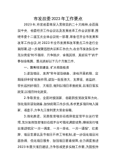 市发改委2023年工作要点2023年,市发改委将深入贯彻党的二十大精神,全面落实中央、省委经济工作会议以及发展改革工作会议部署,围绕市委十二届五次全体会议统一部署,筹备召开全市发展和改革工作会议,对2023年全市发展和改革重点工作进行全面部署,进一步凝聚思想共识和工作合力,在全市发改队伍中充分营造“时不我待、只争朝夕、舍我其谁、真抓实干”的干事创业氛围。重点抓好以下几个方面工作。一、聚焦项目建设,扩大有效投资1.谋划项目。发挥“常年谋划储备、滚动开展前期、定期组织申报”机制作用,谋划一批投资大、支撑强、效益好、管长远的好项目、大项目,做到以项目承接政策,以项目落实政策,以项目转化政策。2.争取...