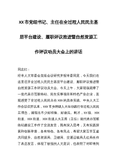 XX市党组书记、主任在全过程人民民主基层平台建设、履职评议推进暨自然资源工作评议动员大会上的讲话同志们:经市人大常委会党组会议研究并报市委同意,今天我们在这里召开全过程人民民主基层平台建设、履职评议推进暨自然资源工作评议动员大会。今天上午,大家现场观摩了一批代表示范联络站、民生实事项目和特色产业企业,直观感受了全过程人民民主在XXX的具体实践。中央人大工作会议召开以来,XXX市乡两级人大生动践行全过程人民民主理念,涌现出不少好经验、好做法。刚才,XX镇、XXX街道、XXX街道、XXX街道人大主席(主任)就代表示范联络站建设工作作了交流发言,既有深入思考,又有实践探索和创新举措,各有特色、各有亮...