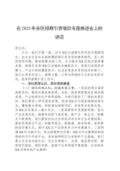 在2025年重大项目建设和招商引资高质量发展推进会上的讲话同志们:今天,我们齐聚一堂,召开XX区2025年重大项目建设和招商引资高质量发展推进会,这是一次关乎XX区未来发展走向的重要会议。过去一年,在全区上下的共同努力下,我们在项目建设与招商引资领域取得了一定成绩,但也要清醒认识到存在的差距与不足。新的一年,机遇与挑战并存,我们必须以更高的站位、更强的担当,全力以赴推动XX区在项目建设和招商引资工作上实现新突破。一、深化思想认识,认清项目工作重要意义(一)项目建设是经济增长的核心动力。从统计数据来看,近年来,重大项目投资对区域GDP增长的贡献率持续走高。每一个落地并顺利推进的重大项目,都如同为...
