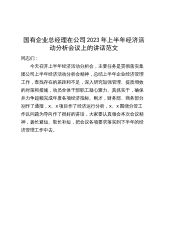 国有企业总经理在公司2023年上半年经济活动分析会议上的讲话范文同志们:今天召开上半年经济活动分析会,主要任务是贯彻落实集团公司上半年经济活动分析会精神,总结上半年企业经济管理工作,查找存在的差距和不足,深入研究加强管理、提质增效的对策和措施,动员全体干部职工凝心聚力、真抓实干,确保并力争超额完成年度各项经济指标。刚才,财务部、商务部分别作了通报,x、x项目作了经济运行分析,x、x围绕分管工作以问题为导向作了很好的讲话,大家要认真领会本次会议精神,扬长避短、取长补短,把会议各项要求落实到下半年的经济管理工作中去。从分析数据来看,今年以来,全公司上下实干拼搏,各单位、各业务系统均做了大量工作,新...
