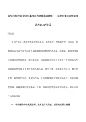 加快转型升级全力打赢项目大突破这场硬仗——在全市项目大突破动员大会上的讲话同志们:今天的会议,是近年来全市规格最高、规模最大、范围最广的一次大会,是贯彻落实习近平总书记在X调研重要讲话精神的动员会、部署会,是推动项目大突破的攻坚誓师会、责任落实会,目的就是向全市上下发出一个强烈的信号,项目建设是当前X全局工作的头版头条、重中之重,必须举全市之力、聚全民之智,以昂扬的斗志、务实的作风,全力打赢项目大突破这场硬仗,构筑X转型发展、跨越发展的坚实基础。下面,根据市委常委会研究的意见,我先讲四个方面的问题:一、项目建设牵动发展全局,没有项目大突破,就没有发展大跨越项目大突破是市委、市政府确定的三大主题...