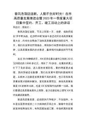 春风浩荡征途新,人勤不负好时光!在市高质量发展推进会暨2023年一季度重大项目集中签约、开工、竣工活动上的讲话同志们,朋友们:春风浩荡征途新。节后上班第一天,省委、省政府就以“开年即决战、起步即冲刺”的奋斗姿态召开全省高质量发展大会,向全社会释放了加快高质量发展的强烈信号。今天,我们在这里召开现场会,用实际行动贯彻省的会议精神,以高质量发展的步步推进,赢得现代化建设的节节胜利。走过35年峥嵘岁月,XX经济总量从建市之初的22亿元到现在的1500多亿元,增长了70多倍,在量的积累上打下了良好基础。进入新的发展阶段,量的增速逐步减缓、质的突破还在酝酿,我们在发展中遇到的困难和问题,从根本上说都是发...