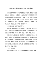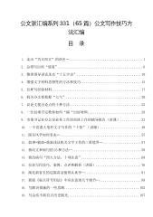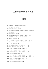 文稿写作技巧汇编(75篇)目录1.22种领导讲话稿的写作套路…12.编写信息的五大秘诀…43.变写稿为想稿变模仿为创造变堆砌为推敲…74.标题处理方法135.党建范畴相近词语的辨析及体悟…166.顿号十不用…237.多年实践中总结的三条公文写作技巧258.工作汇报写法289.工作总结起草的方法和技巧…3010.工作总结写作的八种角度…3311.工作总结怎样扩展为汇报材料3612.公文标题的拟制…4013.公文行文标点符号使用常见12个错误…5114.公文开头写作的基本原则…5515.公文论证实例分析…5816.公文写作的基本规律、要求和方法…6017.公文写作能力是诸多能力的综合体现…6818...