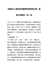在参加XX省机关文稿写作培训班心得:信息工作的识、时、实X月XX—XX日,省委办公厅利用周末时间,高规格组织开展了全省机关文稿写作培训班,对全省文稿写作人员进行系统、全面、深入的“办文”工作培训,课程紧凑、内容丰富、解渴管用,让我们深受启发、受益匪浅。作为信息战线的同志,听了培训讲解,结合平时工作,有以下几点体会。一是信息要有“识”。“识”就是“认识”“见识”“辨识”。第一,提高认识。培训中反复讲到,党委信息工作,是为党委和领导决策服务的,发挥的是以文辅政的参谋助手作用。所以信息人员要时刻心中有站位、胸中有大局,着眼着心着笔于中心工作聚焦处、党委领导关切处,才能写出有价值的信息。第二,拓展见识...