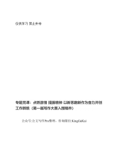 仅供学习禁止外传 专题党课:点燃激情提振精神以新思路新作为奋力开创工作新貌(第一届写作大赛入围稿件)公众号:公文写作Pro整理,咨询微信:KingGuKai同志们:今天,我把机关党员干部和村(社区)党组织书记储备干部都请过来,为大家讲一次党课,主要目的是和大家聊聊党的历史、谈谈XX发展的历程,探讨当前发展的形势,挖掘阻碍发展的问题、重点还是要谈出有助于推动工作的新思路新办法,进一步统一思想、凝聚共识,点燃激情、提振精神,以新思路新作为奋力开创XX工作新貌。下面,我把自己的一些想法跟大家聊聊。一、重温党史,树牢树高政治思想站位在座各位都是党员,但是我们有多少同志了解我党的发展历史,譬如今年是建党...
