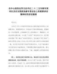 在中心组传达学习总书记二Ο二五年新年贺词以及在全国政协新年茶话会上的重要讲话精神时的讲话提纲同志们:总书记二〇二五年新年贺词和在全国政协新年茶话会上的重要讲话,深情回顾过去一年的奋斗历程和辉煌成就,展望新的一年光明前景,必将激励亿万人民砥砺奋斗、勇毅前行,创造出新的光辉业绩。今年是“十四五”规划收官之年。我们要深刻领悟“两个确立”的决定性意义,坚决做到“两个维护”,始终在思想上政治上行动上同以同志为核心的党中央保持高度一致,扛牢总书记和党中央赋予的使命任务,矢志不渝沿着总书记指引的方向奋勇前进,不断集聚发展新动能新优势,通过顽强斗争打开事业发展新天地。下面,我强调几点贯彻落实意见:第一,保持坚...