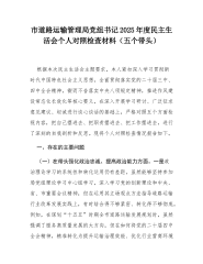 区公共资源交易中心副主任2025年度民主生活会个人对照检查材料(五个带头)根据本次民主生活会主题要求,本人在深入学习党的二十届三中、四中全会精神,重温总书记系列重要讲话和重要指示批示精神,持续深化中央八项规定精神学习教育的基础上,紧密联系个人思想、职责分工和工作实际,严格按照“把自己摆进去、把职责摆进去、把工作摆进去”的要求,深入查摆自身存在的突出问题,深刻剖析思想根源,并明确了今后的整改方向。现将对照检查情况报告如下。一、对照五个“带头”要求查摆存在的主要问题本人聚焦民主生活会主题,紧扣分管领域政府采购、土地出让、农村产权交易等核心业务,围绕五个“带头”方面,进行了全面细致的对照检视,共查摆...