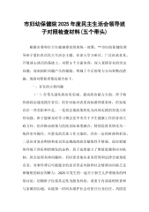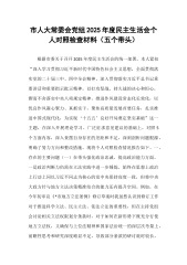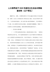 人大常委会副主任2025年度民主生活会个人对照检查材料(五个带头)按照市委关于召开2025年度民主生活会的统一部署和要求,会前,我认真学习了习近平新时代中国特色社会主义思想,系统重温了党的二十大精神和二十届三中、四中全会精神,深入研读了习近平总书记系列重要讲话和重要指示批示精神,并结合近期关于深入贯彻中央八项规定精神的专题学习教育,紧扣本次民主生活会主题,通过深入基层调研、广泛征求意见、开展谈心谈话等方式,对照“带头强化政治忠诚、提高政治能力”“带头固本培元、增强党性”“带头敬畏人民、敬畏组织、敬畏法纪”“带头干事创业、担当作为”“带头坚决扛起管党治党责任”五个方面,深入查摆了自身存在的问题,...