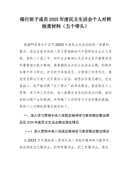 办公室干部2025年度组织生活会个人对照检查材料(五个对照)根据本次组织生活会的要求,我紧扣会议主题,在深入学习党的二十届四中全会精神和深入贯彻中央八项规定精神学习教育的基础上,对照党员标准和岗位职责,结合自身思想、工作、作风实际,认真查摆了自身存在的问题,深刻剖析了问题产生的根源,并明确了今后的努力方向和整改措施。现将个人对照检查情况报告如下。一、存在的问题(一)在学习贯彻党的创新理论方面,理论武装的深度不扎实,学用结合的契合度不紧密一是理论学习系统性不强。在学习习近平新时代中国特色社会主义思想过程中,对理论体系的整体性把握不深不透,往往是根据上级安排和党支部学习计划按部就班地进行,主动、系...