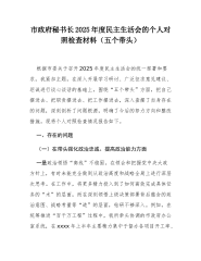 XX市工业和信息化商务局2025年度民主生活会班子对照检查材料(五个带头)根据市委统一安排部署,XX市工业和信息化商务局领导班子紧扣本次民主生活会主题,于会前组织了为期3天的集中学习研讨,深入学习了党的二十届三中、四中全会精神及习近平总书记系列重要讲话精神。班子成员之间、班子成员与分管科室负责人、与基层党员干部代表之间开展了三轮、共计45人次的谈心谈话。通过发放征求意见函、召开座谈会等方式,广泛征求到来自服务企业、下级单位及机关内部的意见建议87条。在此基础上,班子深刻查摆问题、剖析根源,明确了整改方向。一、存在的问题(一)在带头强化政治忠诚、提高政治能力方面一是理论武装的系统性不强,转化运用...