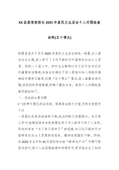 XX县残疾人联合会2025年度民主生活会个人对照检查材料(五个带头)按照县委关于召开2025年度民主生活会的统一部署和要求,我紧扣“深入学习贯彻习近平新时代中国特色社会主义思想,全面贯彻落实党的二十届三中、四中全会精神,深入贯彻落实习近平总书记重要讲话和重要指示批示精神,以打攻坚战、持久战的决心和恒心,锲而不舍落实中央八项规定精神,推进作风建设常态化长效化,以优良作风凝心聚力、真抓实干,聚焦高质量发展首要任务,扎实推进中国式现代化,为实现‘十五五’良好开局奠定坚实基础”这一主题,在深入学习研讨、广泛征求意见、开展谈心谈话的基础上,重点围绕“五个带头”方面,把自己摆进去、把职责摆进去、把工作摆进...