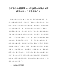 XX古建筑保护研究院2025年度民主生活会领导班子对照检查材料(五个带头)根据上级党组织的统一部署和要求,XX古建筑保护研究院领导班子在深入学习研讨、广泛征求意见、开展谈心谈话的基础上,紧扣本次民主生活会主题,对照习近平新时代中国特色社会主义思想,对照党的二十届三中、四中全会精神,对照党章党规党纪,对照初心使命,紧密联系研究院工作实际和班子成员思想、作风实际,深入查摆突出问题,深刻剖析问题根源,明确了今后的努力方向和整改措施。现将班子对照检查情况报告如下。一、存在的主要问题(一)在带头强化政治忠诚、提高政治能力方面,政治引领力锤炼不纯粹一是理论武装与业务实践融合不紧密。班子在组织学习贯彻党中央...