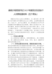 某市委政法委员会领导班子2025年度民主生活会对照检查发言材料(五个带头)根据中央和省委、市委关于开好2025年度民主生活会的统一部署,市委政法委领导班子紧扣“深入学习贯彻习近平新时代中国特色社会主义思想,全面贯彻落实党的二十届四中全会精神,以打攻坚战、持久战的决心和恒心,推进作风建设常态化长效化,以优良作风凝心聚力、真抓实干,奋力开创中国式现代化建设新局面。”主题,扎实做好会前各项准备工作。班子成员坚持个人自学与集中研讨相结合,深入学习党的二十届四中全会精神和习近平总书记关于党的自我革命作风建设的重要论述,专题学习《中共中央关于制定国民经济和社会发展第十五个五年规划的建议》,深刻领会党中央关...