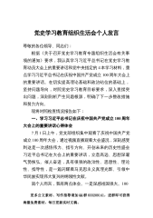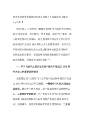 党支部委员党史学习教育专题组织生活会个人剖析发言材料按照党史学习教育办公室关于召开党史学习教育专题组织生活会的安排和部署,本人围绕“学党史、悟思想、办实事、开新局”主体目标,积极贯彻“学史明理、学史增信、学史崇德、学史力行”要求,会前认真学习了习近平总书记在党史学习教育动员大会上的重要讲话、习近平在庆祝建党100周年大会上的讲话和党中央指定的4本学习材料,扎实开展了交流谈心、广泛征求大家意见建议,认真查摆自身存在问题,进行深入党性分析,明确了整改措施。现按照要求作如下检视剖析。一、学习习近平总书记在庆祝中国共产党成立100周年大会上的重要讲话情况通过与办公室同志一同收听收看庆祝中国共产党成立1...
