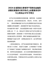 2024在省部级主要领导干部推动金融高质量发展题研讨班开班式上的重要讲话学习心得体会870字简文近平总书记的重要讲话思想深邃、视野宏阔、论述精辟、内涵丰富,具有很强的政治性、理论性、针对性、指导性,。要深刻理解把握习近平总书记重要讲话的丰富内涵精髓要义和实践要求,深刻领悟“两个确立”的决定性意义,坚决做到“两个维护”,切实把思想和行动统一到党中央决策部署上来。下一步,将结合学习贯彻习近平总书记考察XX重要讲话精神,深刻把握“八个坚持”的核心要义以及金融工作的政治性和人民性要求,聚焦“加快建设金融强国”目标,围绕做好“五篇大文章”,统筹推进各项工作,奋力谱写高质量发展新篇章。一是强化职能定位。坚...