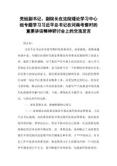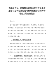 党组副书记、副院长在法院理论学习中心组专题学习习近平总书记在河南考察时的重要讲话精神研讨会上的交流发言同志们:习近平总书记在河南考察时的重要讲话,高屋建瓴、思想深邃内涵丰富,为我们在新时代新征程推动各项事业发展指明了前进方向、提供了根本遵循。对于我们**市中级人民法院而言,深入学习贯彻总书记重要讲话精神,是当前和今后一个时期的首要政治任务,具有重大而深远的意义。我们要深刻领会精神实质,切实把思想和行动统一到总书记重要讲话精神上来,以更加坚定的信心、更加有力的举措,推动法院工作高质量发展,为谱写**大地推进中国式现代化新篇章贡献司法力量。下面,围绕此次专题学习,我谈几点体会,与同志们共同交流。一...
