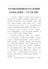 在乡村振兴局党组理论学习中心组专题研讨交流会上的发言(“千万工程”专题)“千村示范、万村整治”工程是习近平总书记在浙江工作时亲自谋划、亲自部署、亲自推动的一项重大决策,全面实施20多年来深刻改变了浙江农村的面貌,造就万千美丽乡村,造福万千农民群众,赢得广泛赞誉。近年来,**县深入学习贯彻习近平总书记关于“三农”工作的重要论述和关于安徽工作的重要讲话重要指示精神,聚焦2024年中央一号文件和省委、省政府“千村引领、万村升级”工程要点,农村人居环境显著提升,农民人均可支配收入持续增长,全县14个乡村振兴产业集中区持续做大做强。标杆引领学,奋力强本领。组建“一把手”考察团队。“千万工程”探索出一条加...