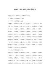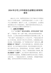 2024年公司上半年政治生态情况分析研判报告2024年上半年,集团党委坚持以习近平新时代中国特色社会主义思想为指导,全面贯彻落实党的二十大和二十届二中全会精神精神,围绕中心大局,立足职能职责,全面推进党的建设各项工作赋能提优,持续巩固发展良好政治生态。现将上半年政治生态情况分析研判如下:一、主要工作开展情况(一)“三个抓手”强化政治建设。延伸政治统领“机制链”。严格落实“第一议题”制度,把政治统领贯彻到党委、党支部、工会等各级党组织和群团组织决策部署全过程,将“两个维护”体现到推动中心工作各环节。严格落实意识形态工作责任制,组织学习研讨和分析研判,定期掌握全局总体态势;开展清查整改,将“党管意...