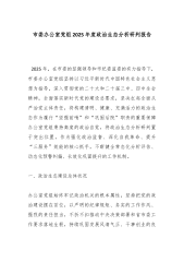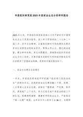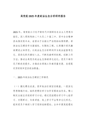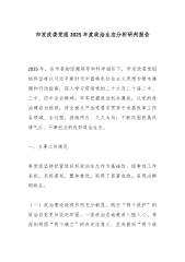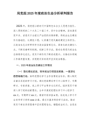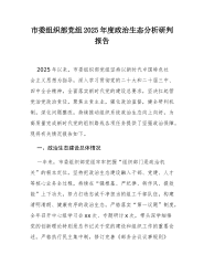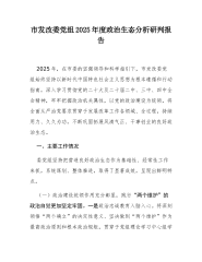 市发改委党组2025年度政治生态分析研判报告2025年,在市委的坚强领导和科学指引下,市发改委党组始终坚持以习近平新时代中国特色社会主义思想为根本遵循和行动指南,深入学习贯彻党的二十大及二十届二中、三中、四中全会精神,牢牢把握政治机关属性,以党的政治建设为统领,将全面从严治党要求贯穿于发展改革工作各领域、全过程,持续用力、久久为功,不断巩固拓展风清气正、干事创业的良好政治生态。一、主要工作情况委党组坚持把营造良好政治生态作为基础性、经常性工作来抓,系统谋划、整体推进,取得了显著成效,呈现出鲜明特点。(一)政治建设统领作用充分彰显,践行“两个维护”的政治自觉更加坚定牢固。一是政治忠诚教育入脑入心...