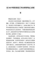 在市委意识形态工作领导小组专题分析研判会上的汇报发言尊敬的××书记,同志们:习近平总书记在党的XX大报告中指出,我们要坚持马克思主义在意识形态领域指导地位的根本制度,建设具有强大凝聚力和引领力的社会主义意识形态,巩固全党全国各族人民团结奋斗的思想基础。在全面建设社会主义现代化国家新征程上,宣传思想战线必须担负起这一战略任务,牢牢掌握党对意识形态工作领导权,扎实做好意识形态工作。根据会议安排,现将有关工作进展情况汇报如下:一、坚持党的领导,确保意识形态工作的正确政治方向。意识形态工作是为国家立心、为民族立魂的工作,决定着国家、民族的前途和命运。“经济建设是党的中心工作,意识形态工作是党的一项极端...