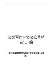 公文写作Pro公众号精选汇编新冠肺炎疫情防控讲话汇报通知汇编(篇)目录1.全市新型冠状病毒感染的肺炎疫情防控工作专题会议上的讲话...........................................................................22.X县防控新型冠状病毒感染的肺炎疫情......................83.发表电视讲话........................................................84.在全省新型冠状病毒感染的肺炎疫情防控工作会议上的讲话..........................