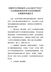 区新时代文明实践中心办公室关于号召广大志愿者积极有序参与全区疫情防控志愿服务的倡议书当前,多省市相继出现新冠肺炎确诊病例,疫情出现反弹。为全力配合我区疫情防控工作,充分发挥广大志愿者和志愿服务组织在联防联控、群防群治中的重要作用,现发出如下倡议:一、提升站位,服从指挥。全区广大志愿者和志愿服务组织要带头遵守关于疫情防控的各项规定,带头落实疫情防控措施,为亲友和身边群众作出榜样。结合疫情防控实际,采取多种有效形式,为孤寡老人和留守儿童、残障人员等生活困难群众排忧解难,通过心贴心的志愿服务,做好强信心、暖人心、聚民心的工作。二、加强宣传,做好表率。要通过权威部门、主流媒体了解和掌握疫情动态,不恐慌...