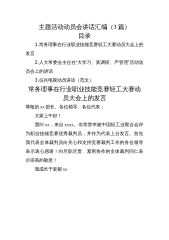主题活动动员会讲话汇编(3篇)目录1.常务理事在行业职业技能竞赛轻工大赛动员大会上的发言2.人大常委会主任在“大学习、真调研、严管理”活动动员会上的讲话3.征兵电视动员讲话(范文)常务理事在行业职业技能竞赛轻工大赛动员大会上的发言尊敬的xx部长、各位领导、各位代表:大家上午好!我叫xx,来自xxxx。非常荣幸被中国轻工业联合会评为职业技能竞赛优秀裁判员,并作为代表上台发言。首先我代表全体裁判员向关心和支持竞赛裁判工作的各位领导表示衷心感谢!向尽职尽责、紧密协作的全体裁判同仁表示崇高的敬意!我成长于瓷都xx,出生于陶瓷世家,从小便随父辈学习陶瓷装饰技术。数十年以来,醉心于陶瓷绘画,在继承父亲传装...