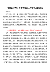 在全区征兵工作会上的讲话同志们:刚才,省、市征兵工作会对202X年征兵工作作了具体安排,并提出了详细的要求;XXX部长总结了去年我区征兵工作,并对今年征兵任务进行了部署,请大家下来后,认真抓好落实。近年来,我区征兵工作的发展势头很好,连续三年“零退兵”,征兵工作“五率”量化考评在全市排名前列。特别是去年,征集新兵XX人,其中大学生XX人,大学生新兵征集比例达到XX.XX%,创下历史新高。这些成绩的取得,得益于区委区政府的坚强领导,得益于军地各级各部门的密切配合,得益于广大征兵工作人员的团结奋斗。借此机会,我代表区征兵领导小组,向长期奋战在征兵战线的同志们致以崇高的敬意和最衷心的感谢!当前,我国...